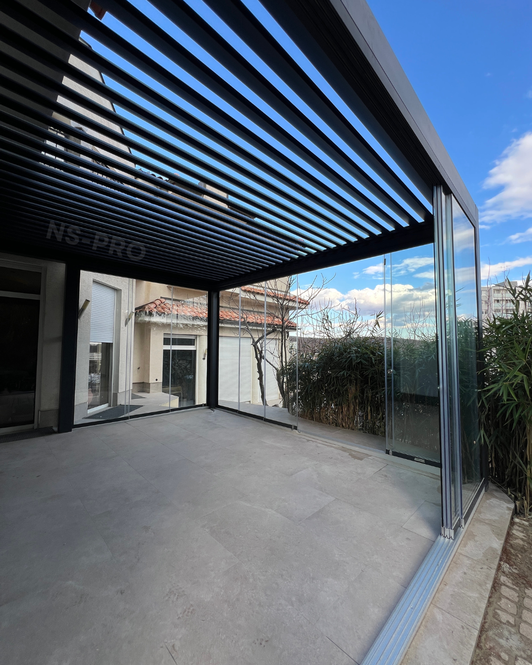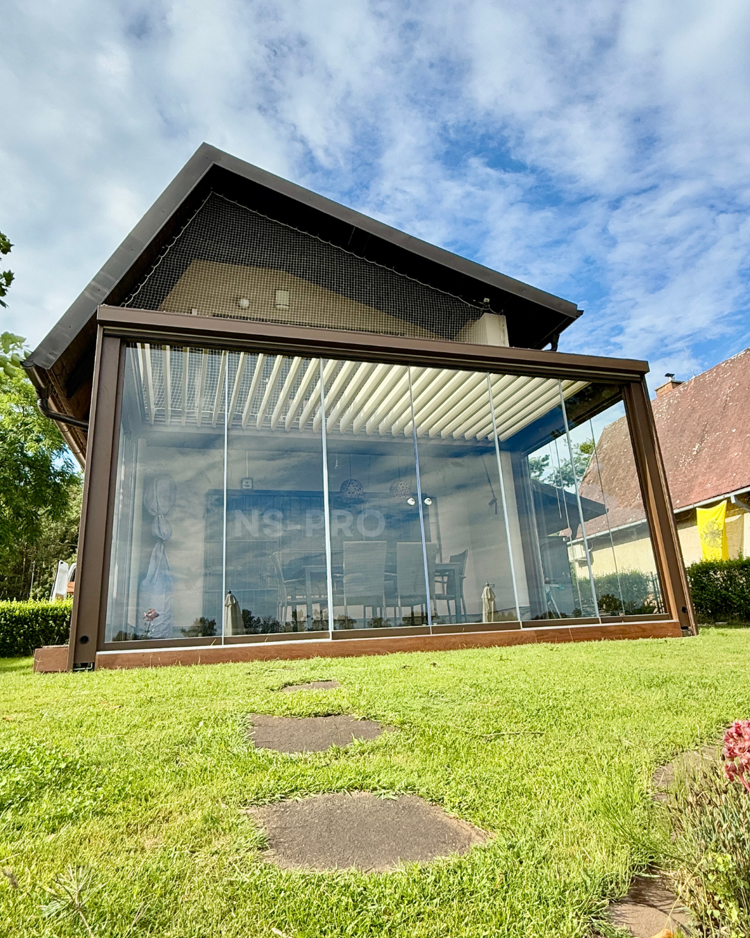 Hliníková bioklimatická pergola s otočnými lamelami na diaľkové ovládanie disponuje prvotriednou kvalitou podloženou testami a certifikátmi. Kombináciou s bezrámovým posuvným zasklením NS-SLIDE alebo posuvno-otočným NS-PIVOT vytvoríte prémiovú zimnú záhradu, ktorú môžete využívať počas celého roka! Bioklimatická zimná záhrada je tvorená hliníkovými profilmi o rozmere 160 x 160 mm, súčasťou ktorej sú naklápacie lamely o rozmere 200 x 40 mm, čo robí pergolu robustnou a odolnou. Najväčšou prednosťou zimnej záhrady je vysoká odolnosť voči vetru a maximálne zaťaženie, ktoré znesie je až 245 kg/m2, ako jediná na trhu, čím sa líši od konkurenčných značiek. Bioklimatická zimná záhrada disponuje unikátnym odvodnením integrovaným do stojky pergoly, kde sú na výber dva typy odvodnenia – voda voľne tečúca stojkou alebo cez 50 mm potrubie. Maximálny rozmer jedného modulu je 6450 x 4700 mm, ktorý pri kotvení do steny domu umožňuje použitie len 2 stojok. Jednotlivé moduly je však možné spájať vedľa seba, za sebou alebo medzi steny. Bioklimatická zimná záhrada je upravená vysoko kvalitnou práškovou farbou z certifikovanej lakovne, ktorá poskytuje záruku 5 rokov na povrchovú úpravu konštrukcie. Ponúka tiež možnosť výberu rozličného príslušenstva či doplnkov.